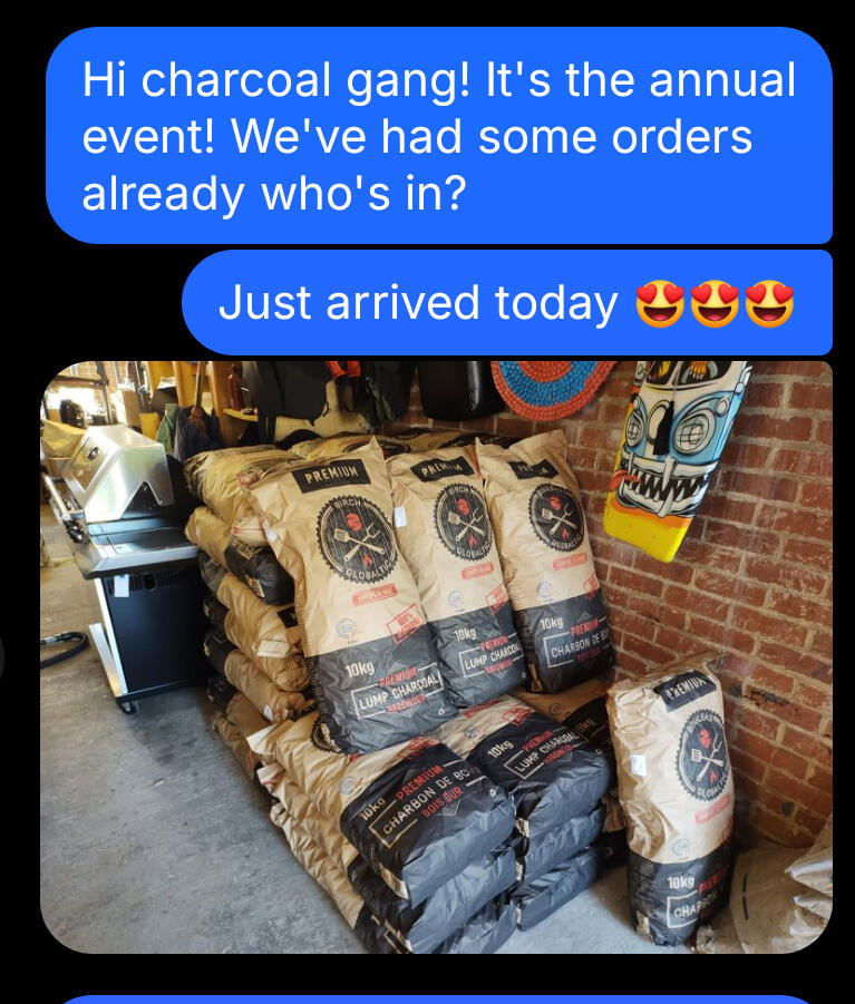 Everyone nods. Someone’s keen. Someone else says they’d definitely be in for a few bags.And they’re right.Buying charcoal together makes total sense — better fuel, better prices, fewer last-minute garden centre runs. Half the time it even turns into a decent excuse to catch up when people come to collect.The only thing that ever gets in the way isn’t enthusiasm.